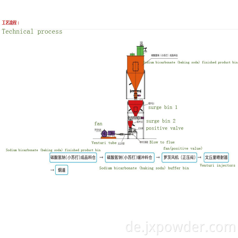 Trockenprozess-Desulfurisierungstechnologie verwendet die Kombination aus Mühle und Lüfterkombination des Bewertungssystems, um das Mahlpulver-Sprühgerät zu vervollständigen, nachdem das natriumbicarbonat feine Pulver poröse Lamellen oder geformtes Struktur, einheitliche Partikelgröße, Feinheit 200-6000 Mesh einstellbar ist, mit Gute Dispersion und dann in festem Superfinpulver durch Hochdruckzentrifugallüfter, direkte Injektion in den Ofen oder im Reaktionsturm, kann es effektiv mehr als 95% des SO2 und HC im Schwanzgas entfernen, und die Entfernungsrate kann 99 erreichen %.